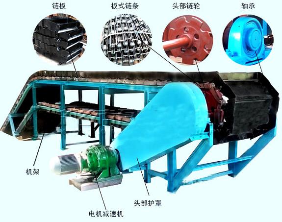 鱗板式輸送機由頭輪裝置、鱗板鏈條裝置、尾輪張緊裝置、導料防護裝置、機架和驅動裝置等構成。